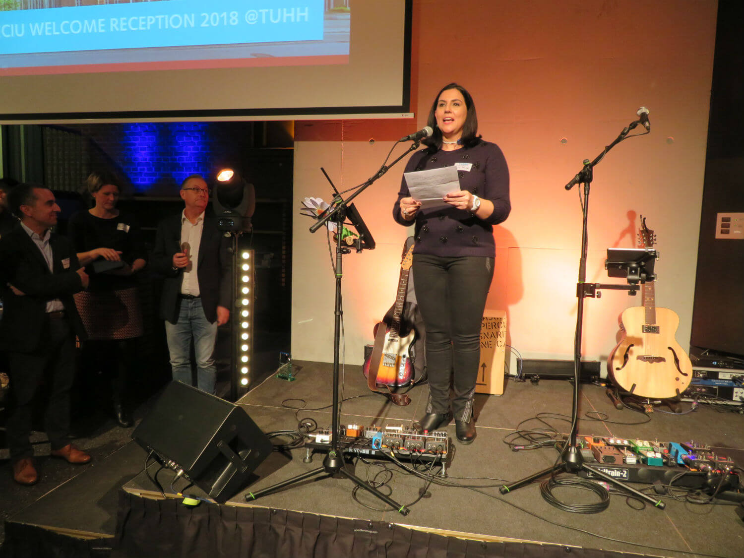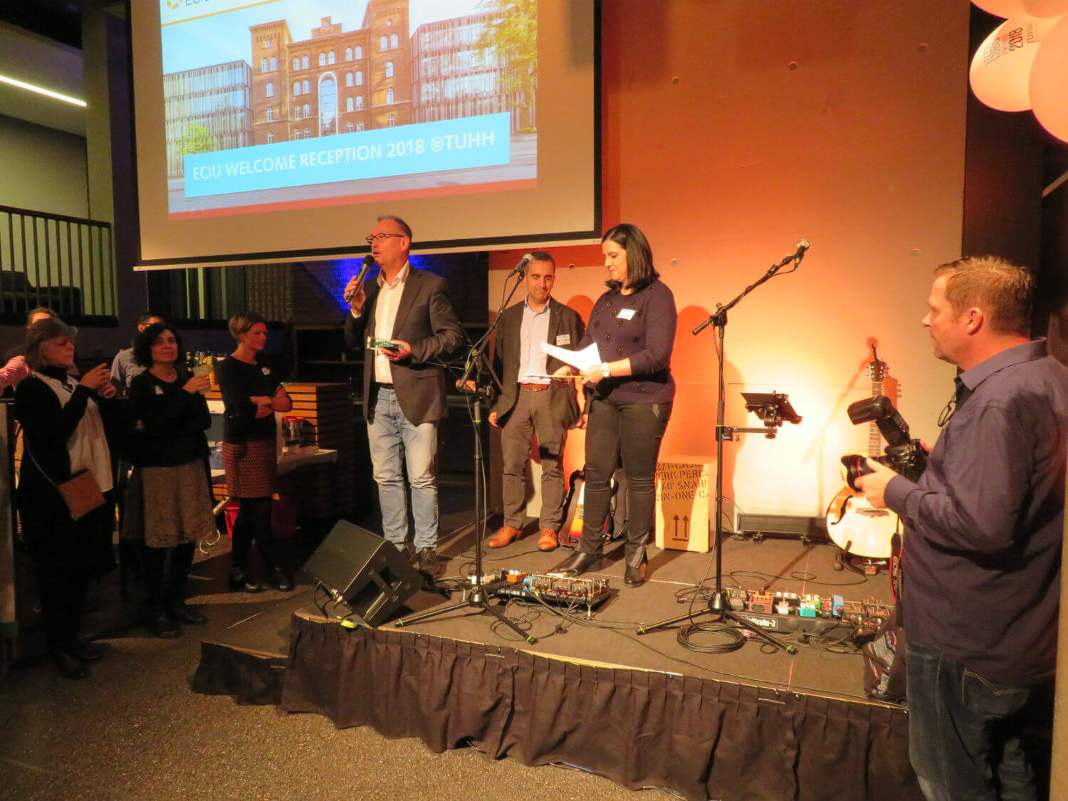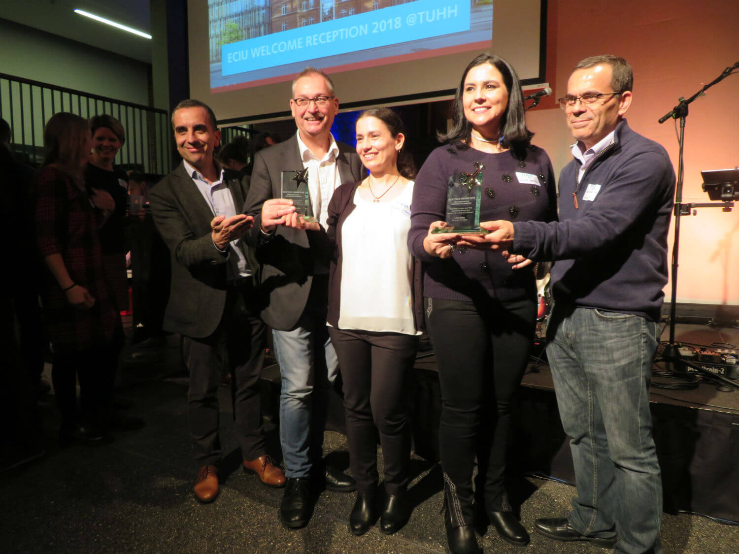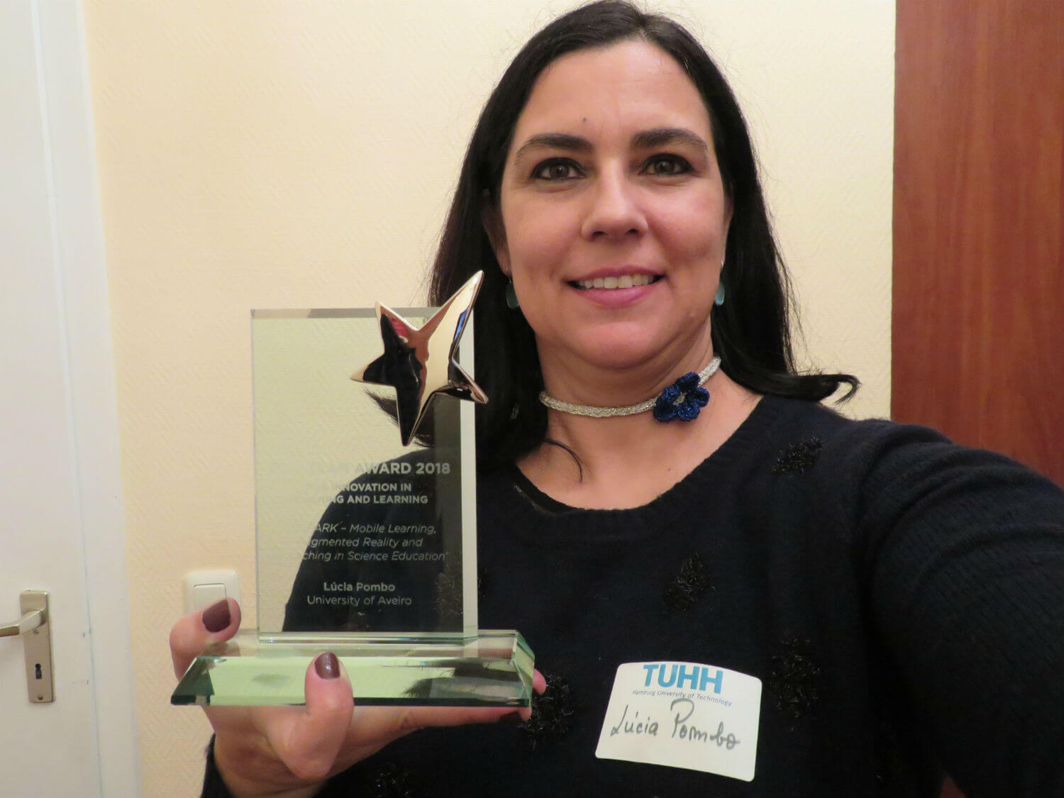 Lúcia Pombo, coordenadora do EduPARK, e Margarida M. Marques, bolseira de investigação do Projeto, foram no dia 14 de novembro a Universidade Tecnológica de Hamburgo, Alemanha, receber o prémio pelas mãos de Mark Brown, Presidente do Conselho de Administração do ECIU, e de Màrius Martínez, Vice-Reitor para as Relações Internacionais da Universidade Autónoma de Barcelona. Em nome da equipa EduPARK, a coordenadora Lúcia Pombo começou por agradecer à instituição que hospeda o projeto galardoado, o Centro de Investigação em Didática e Tecnologia na Formação de Formadores (CIDTFF) da UA, e explicou a essência do EduPARK com recurso a uma flor, em que cada pétala correspondia a um elemento essencial do projeto, jogando o jogo do “bem-me-quer, mal-me-quer”. No final, o projeto foi amplamente elogiado e a equipa foi parabenizada pela comunidade científica internacional. Na cerimónia marcaram presença os membros da ECIU-UA, o Vice Reitor Artur Silva e o Assessor Sénior das Redes Universitárias da União Europeia, Niall Power.
