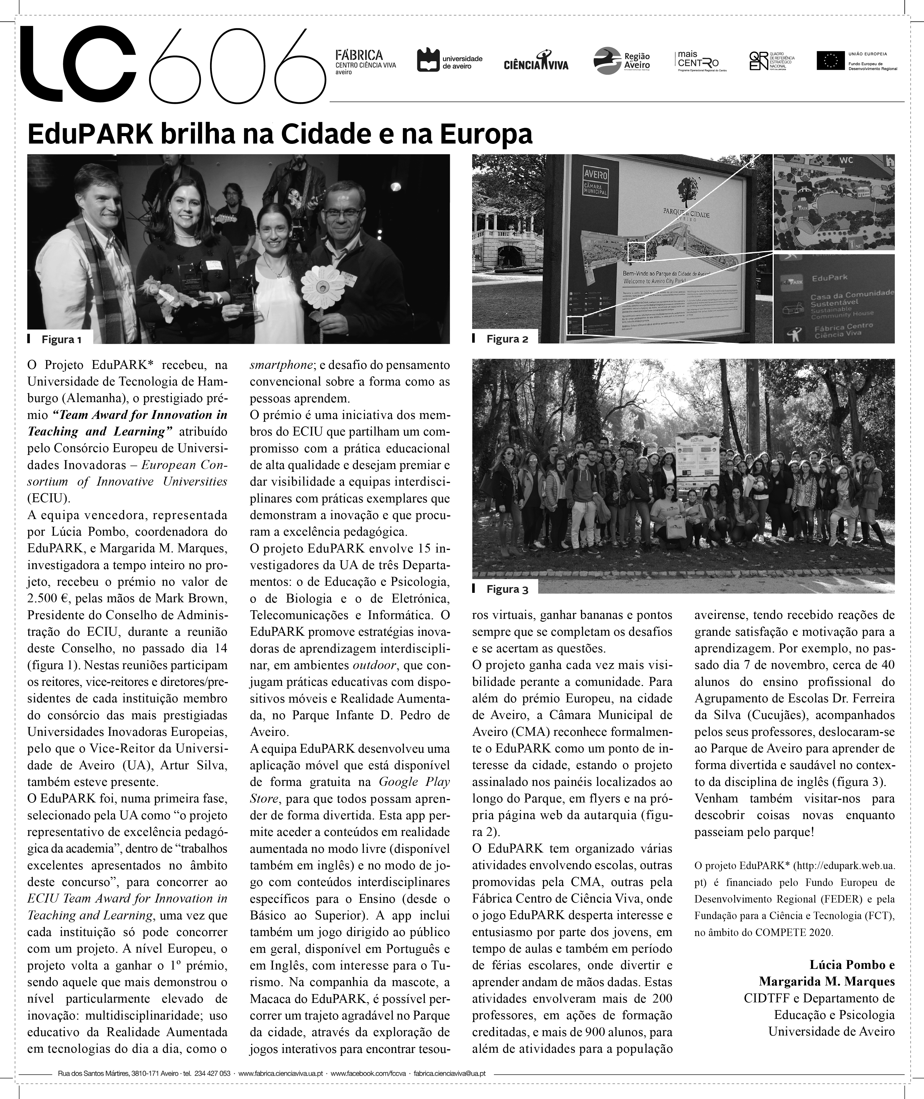 A notícia relacionada com este evento, “EduPARK brilha na Cidade e na Europa”, foi publicada no Diário de Aveiro no dia 19 de novembro, na secção Laboração Contínua, p. 24, onde se explica o projeto e a relevância do referido prémio. Pode ser lida aqui: http://uaonline.ua.pt/upload/med/joua_m_5312.pdf