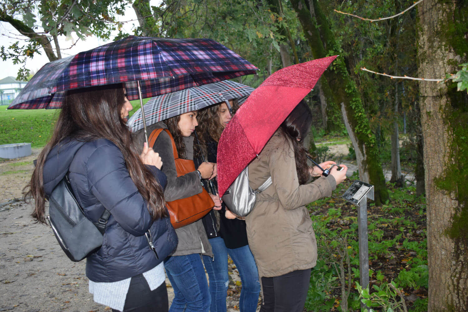 Depois de aula teórica de apresentação do Projeto EduPARK, as duas turmas de CIN II desenvolveram a atividade no Parque Infante D. Pedro, onde exploraram um guião educativo com um percurso específico, onde se integram questões articuladas com os conteúdos programáticos de CIN I e CIN II, através da app do projeto EduPARK. Os estudantes aprenderam in loco, tendo sido fomentada uma aprendizagem autêntica, com base nos princípios de geocaching e explorando os recursos em Realidade Aumentada em azulejos e placas de identificação que se encontram espalhadas pelo parque.