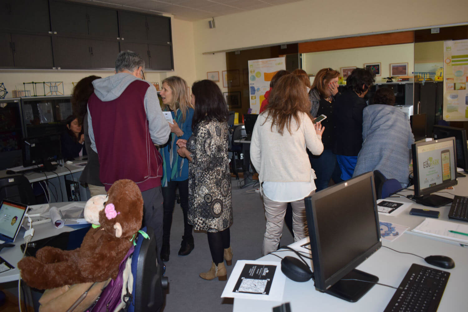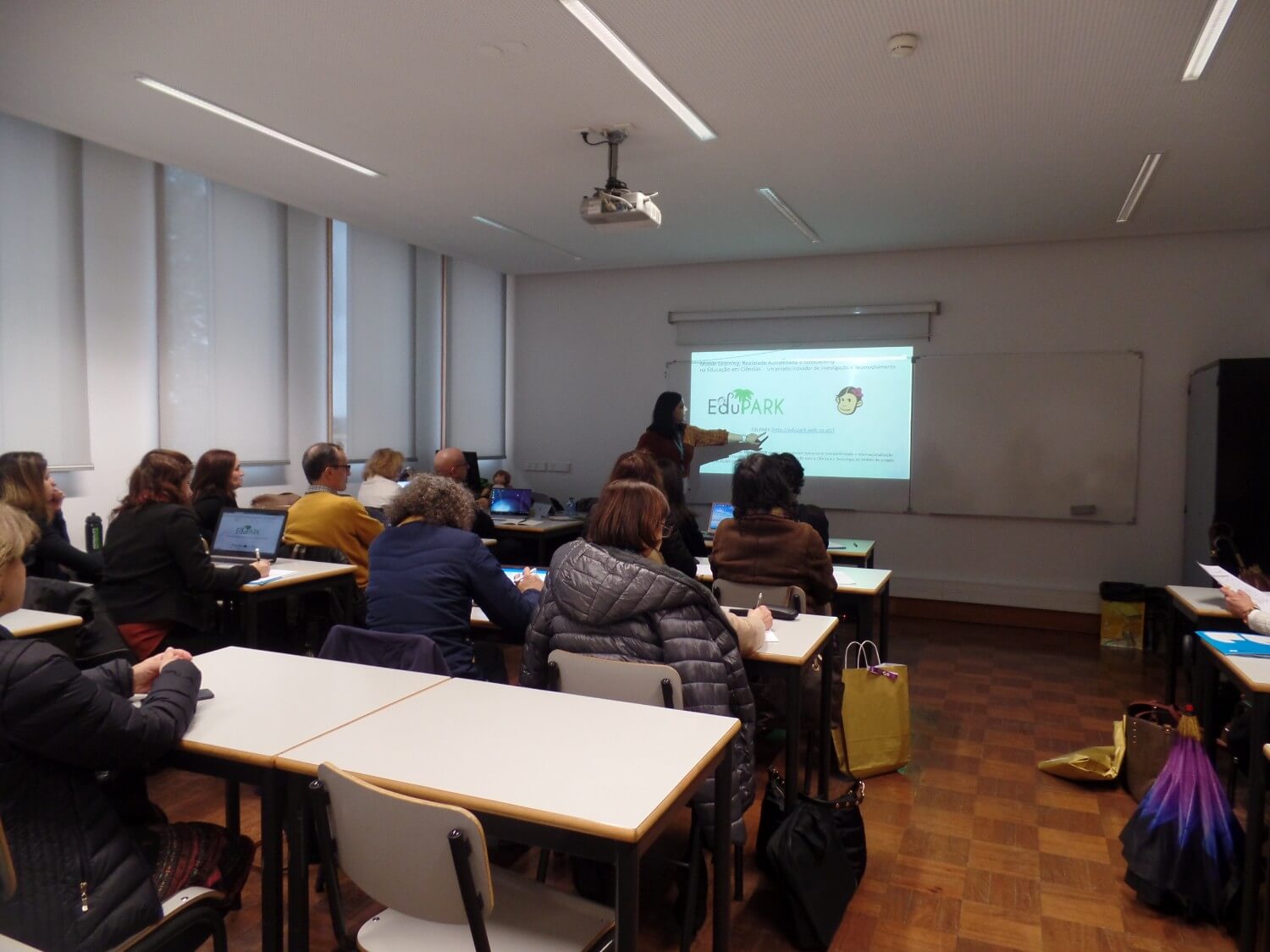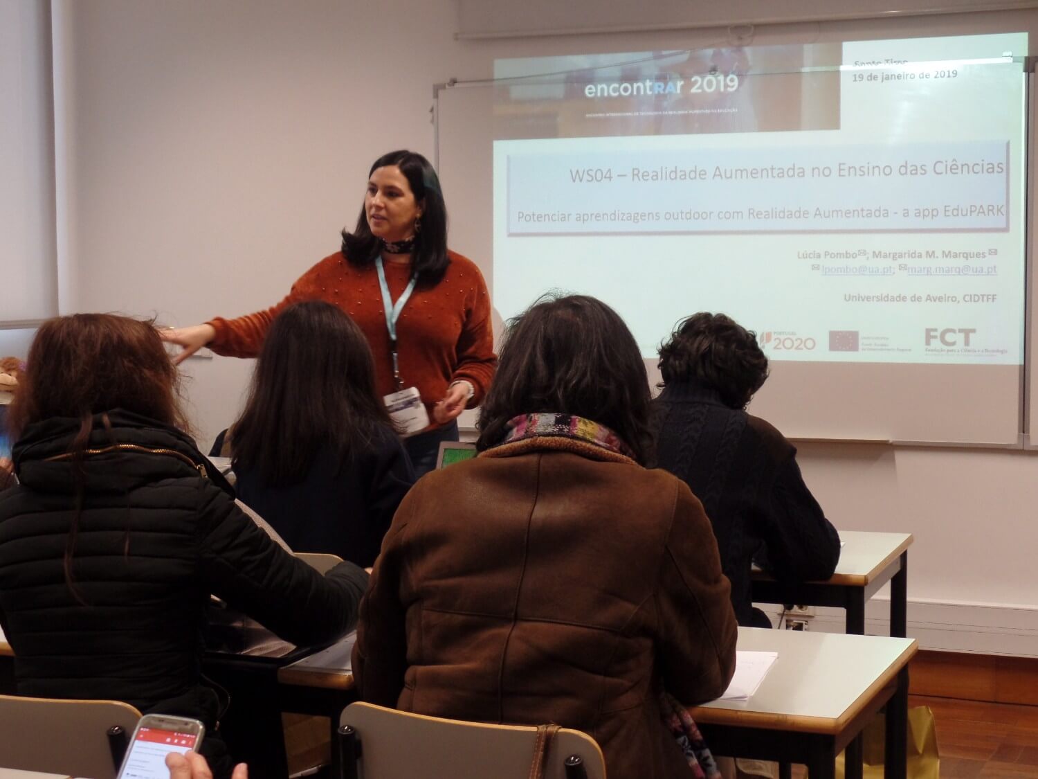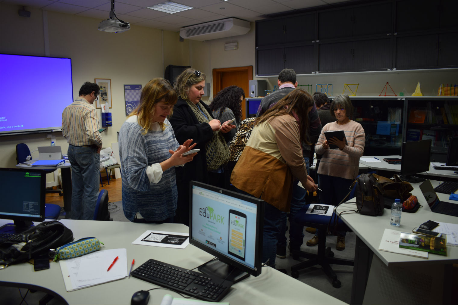 Nesta formação acreditada, que decorreu a 19 de janeiro na Escola Secundária Tomaz Pelayo, professores de ciências do ensino não superior tiveram a oportunidade de explorar a app EduPARK como se estivessem no parque de Aveiro, experimentando o jogo e usufruindo da realidade aumentada, a maioria, pela primeira vez. Numa segunda fase do workshop, os professores produziram colaborativamente recursos educativos numa ótica de mobile learning baseado no jogo e com Realidade Aumentada. Por fim, partilharam e discutiram os seus recursos, identificando pontos fortes e pontos suscetíveis de melhoria nos trabalhos de cada grupo.