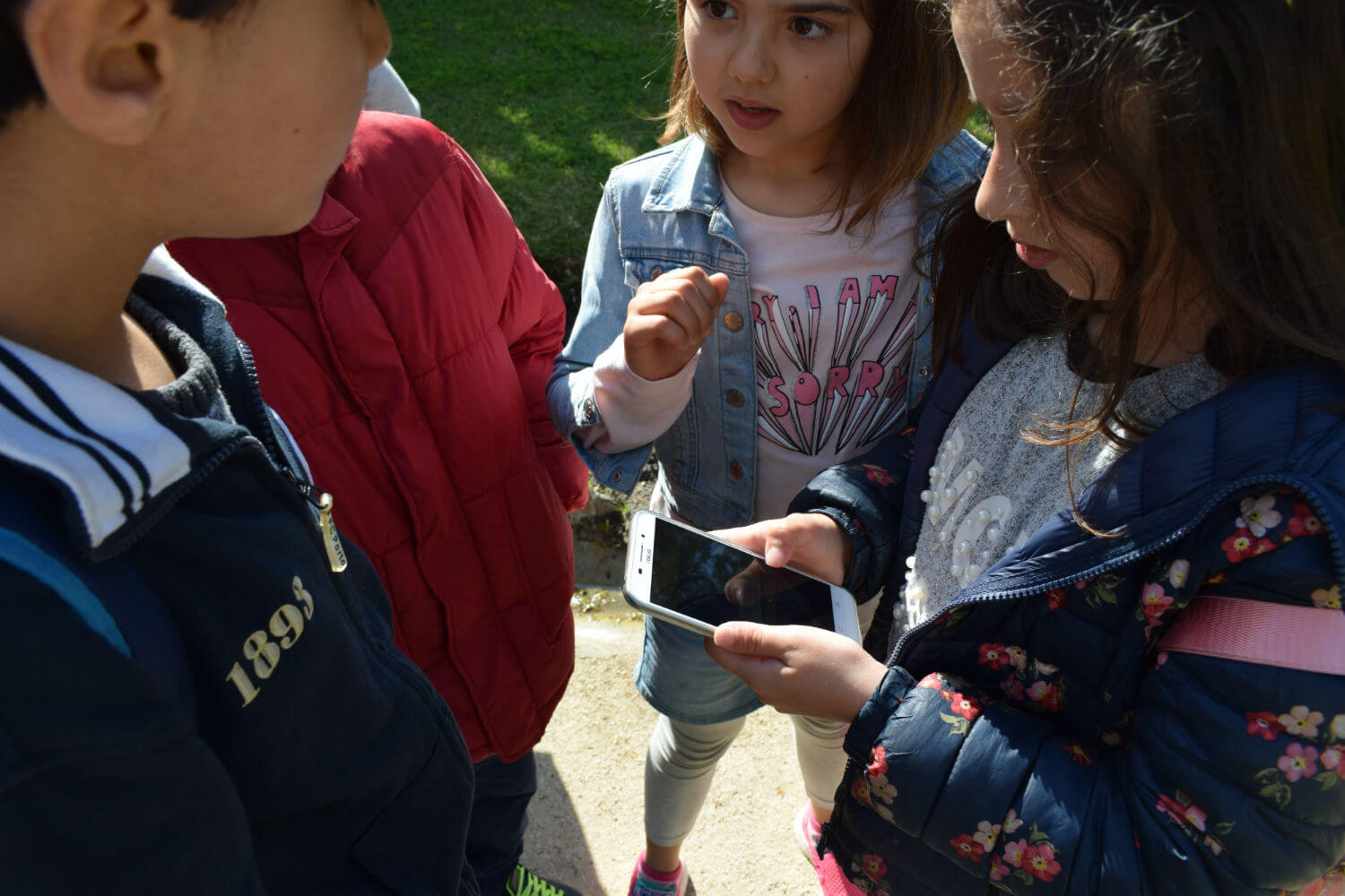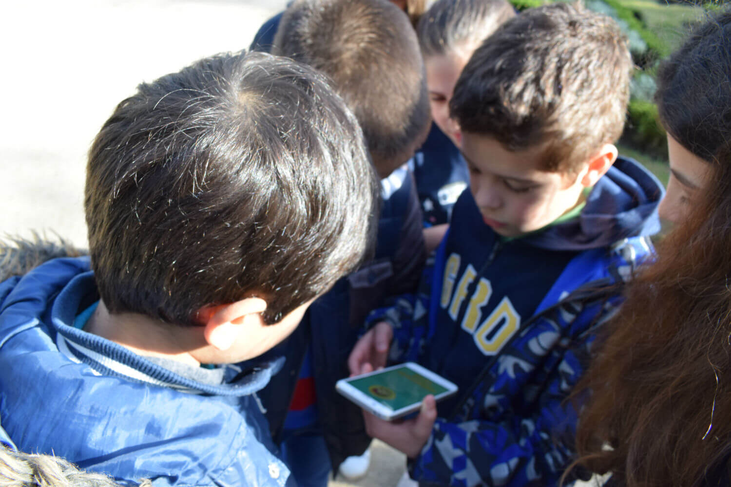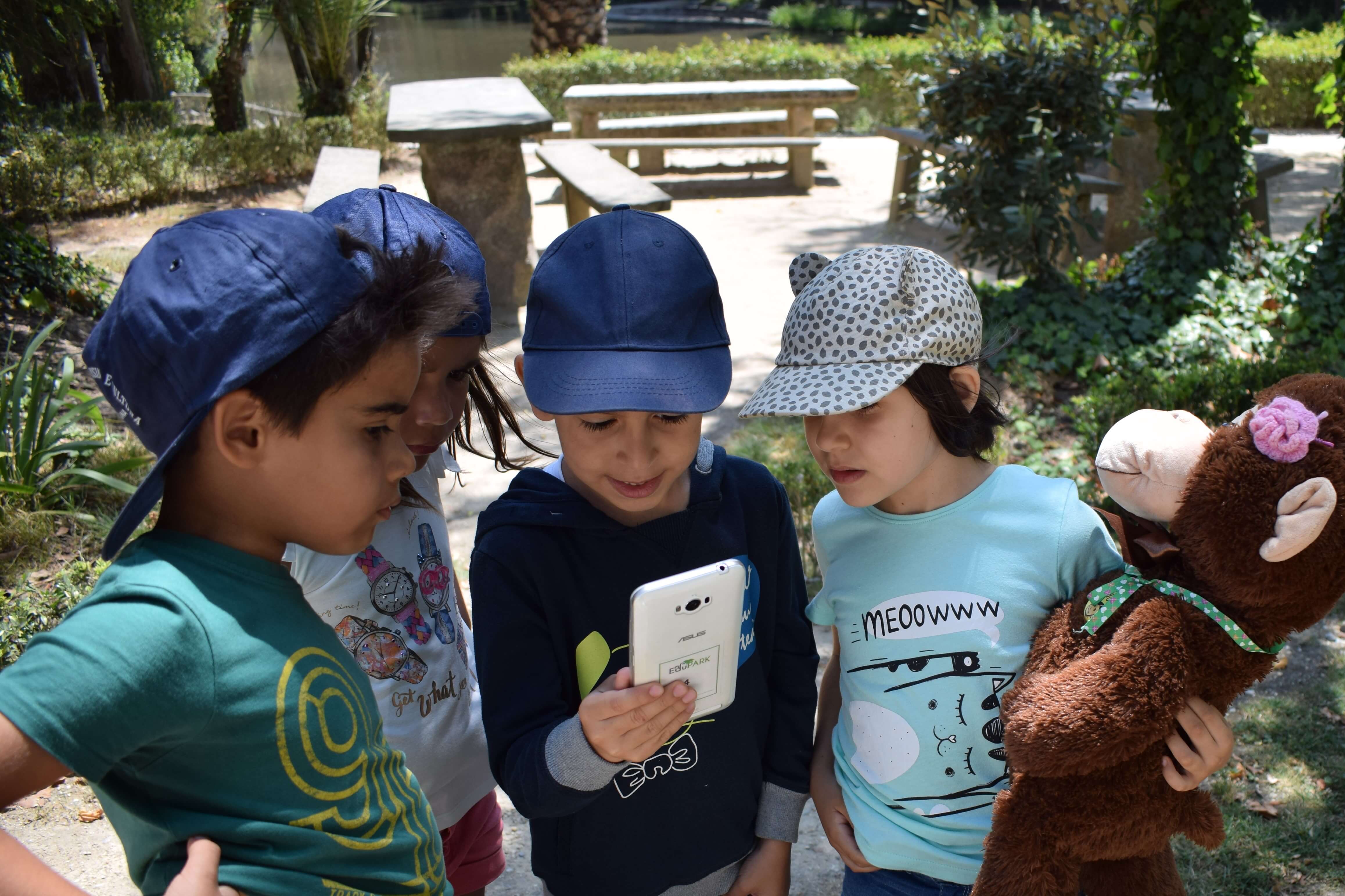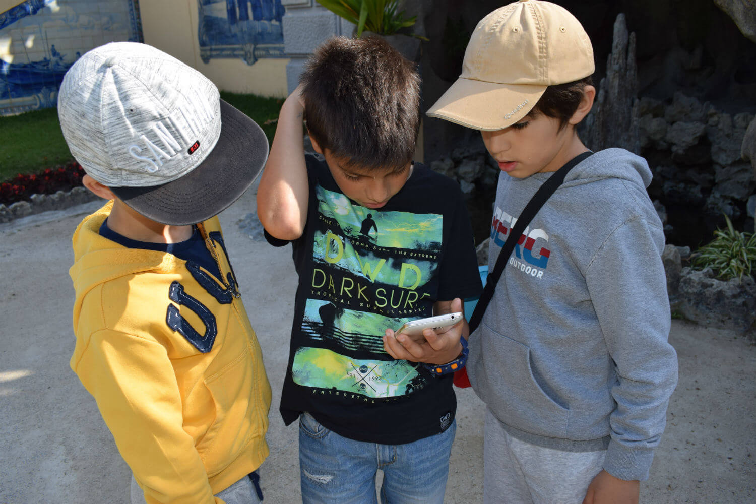 Foi com muita alegria e boa disposição que as crianças, em pequeno grupo, usaram smartphones com a aplicação móvel do EduPARK para jogar um quiz interdisciplinar, interativo, com acesso a conteúdos em Realidade Aumentada e que envolve a busca de tesouros virtuais.