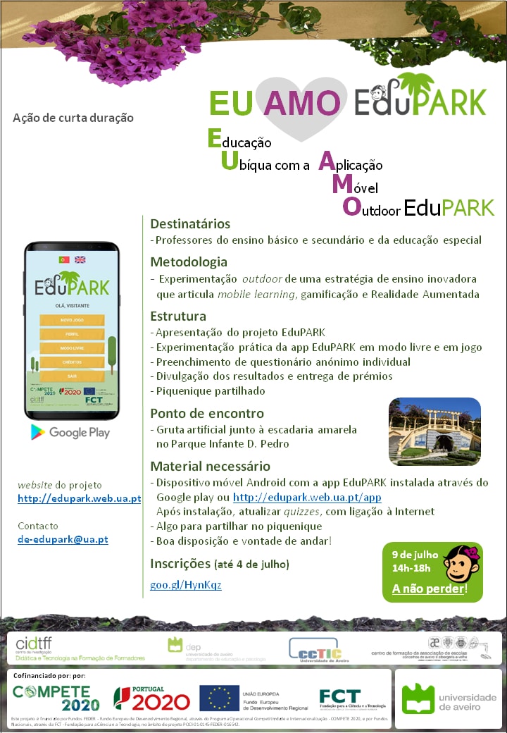 É com prazer que a equipa do EduPARK convida professores a participar na Ação de Formação de Curta Duração (4 horas) “EU AMO EduPARK - Educação Ubíqua com a Aplicação Móvel Outdoor EduPARK”. Trata-se de uma formação acreditada, inovadora e totalmente ao ar livre, que terá lugar no Parque Infante D. Pedro, em Aveiro, no dia 9 de julho, das 14h às 18h.
