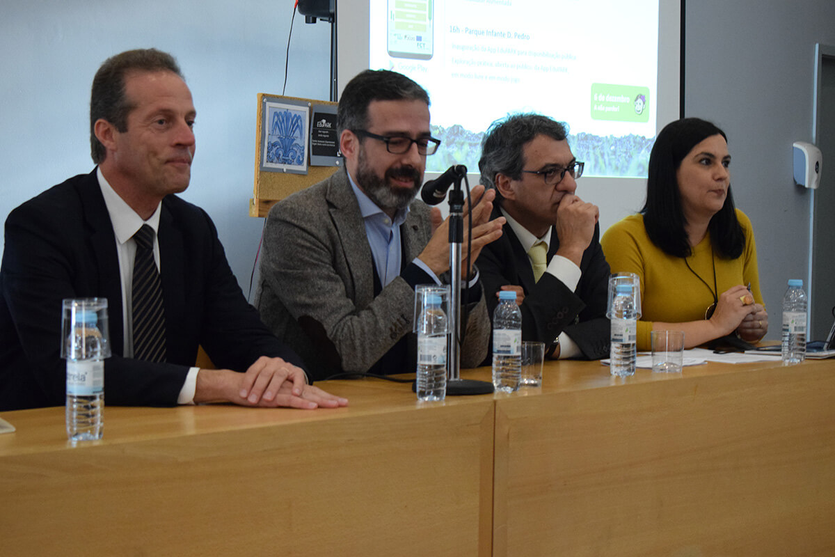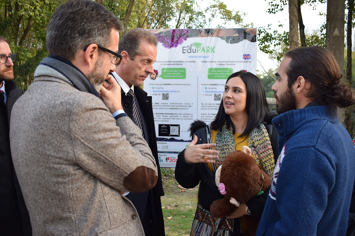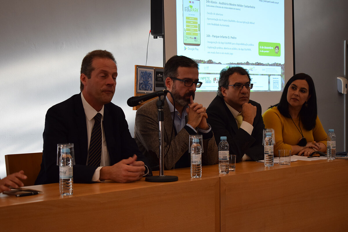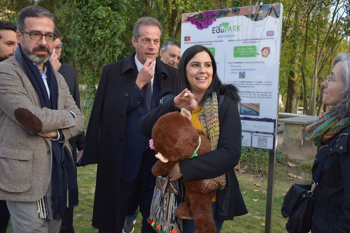 A sessão de inauguração da aplicação EduPARK contou com a presença do Pró-reitor Filipe Teles, em representação do Reitor da Universidade de Aveiro; do Presidente da Câmara Municipal de Aveiro, Ribau Esteves; da Coordenadora do Centro de Investigação em Didática e Tecnologia na Formação de Formadores (CIDTFF), Helena Araújo e Sá; do Coordenador do Instituto de Engenharia Eletrónica e Telemática de Aveiro (IEETA), Armando J. Pinho; do Diretor do Departamento de Educação e Psicologia, Jorge Adelino Costa e da Coordenadora do Projeto, Lúcia Pombo e restante equipa EduPARK.