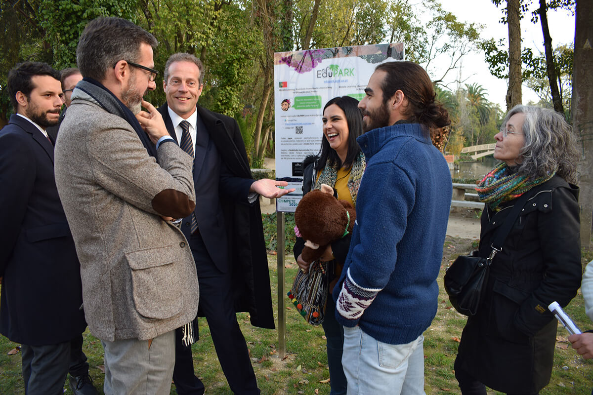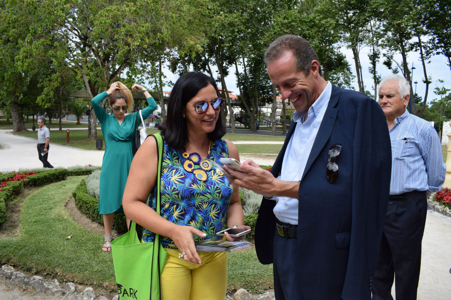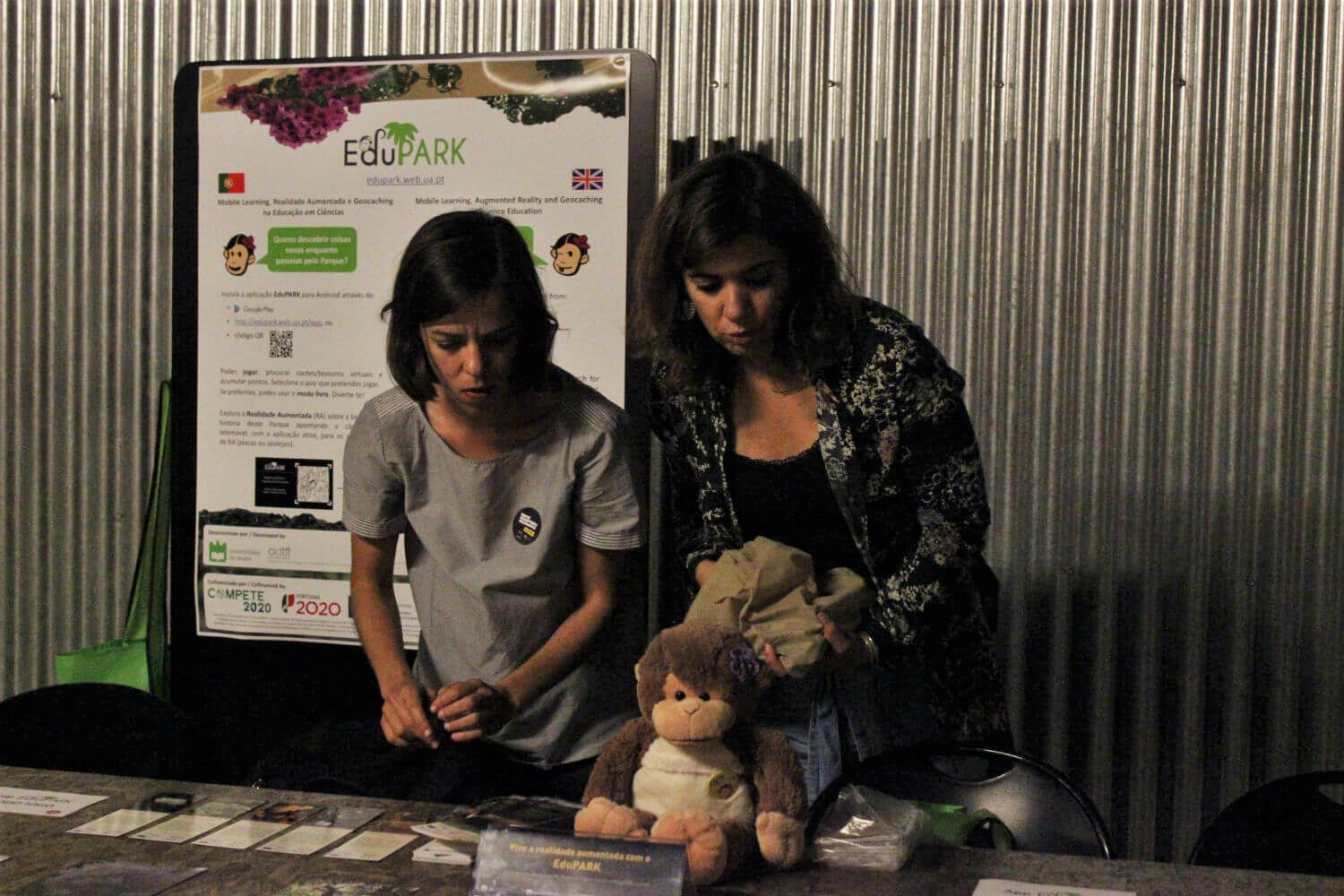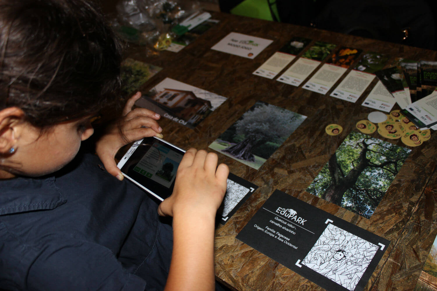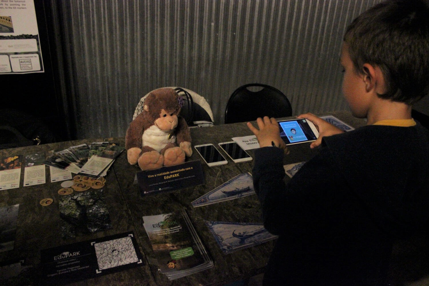 Miúdos e graúdos aproveitaram a oportunidade para conhecer e experimentar a app EduPARK, como se estivessem no Parque Infante D. Pedro, quer em modo livre, ou seja, de exploração livre da realidade aumentada despoletada em placas identificativas de árvores e em azulejos, quer em modo jogo, através de um mini-jogo com quatro questões tipo quiz. As reações foram muito positivas, tendo diversos participantes manifestado interesse em usar a aplicação no próprio Parque.