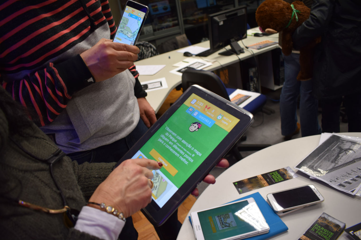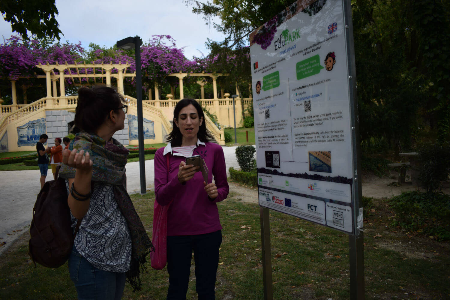 Em grupo, os jovens exploradores percorreram o Parque seguindo as orientações da Macaca da aplicação EduPARK para experimentar a realidade aumentada disponível em diversos pontos de interesse do Parque e descobrir, ou mesmo relembrar, o estado físico da água do lago, as cores primárias de equipamento do jardim infantil e as estruturas reprodutoras de espécies botânicas do Parque, entre outros. O jogo da aplicação EduPARK despertou interesse e entusiasmo por parte dos jovens, que em período de férias se divertiram a aprender, num contexto de aprendizagem não formal.
